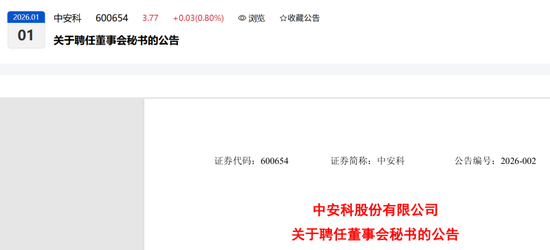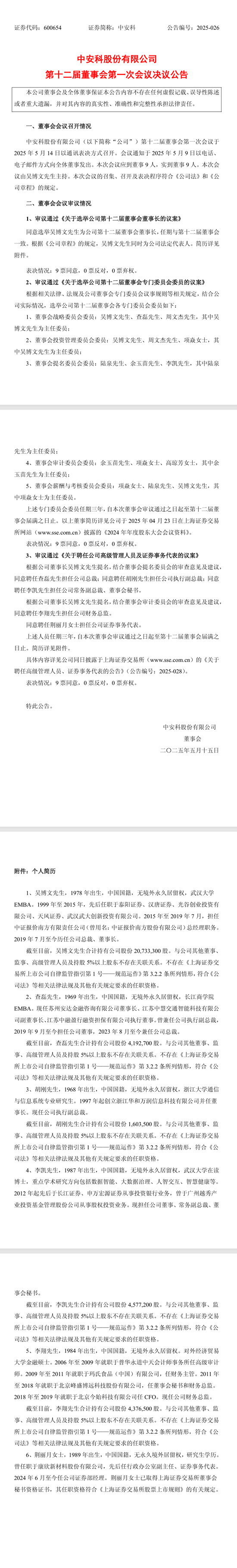 中安科股份有限公司(以下简称“公司”)于2025年12月31日召开第十二届董事会第八次会议,审议通过了《关于聘任公司董事会秘书的议案》,经公司董事会提名委员会审核通过,公司董事会同意聘任朱明先生为公司董事会秘书(简历附后),任期至第十二届董事会届满之日止。董事长吴博文先生将不再行董事会秘书职责。