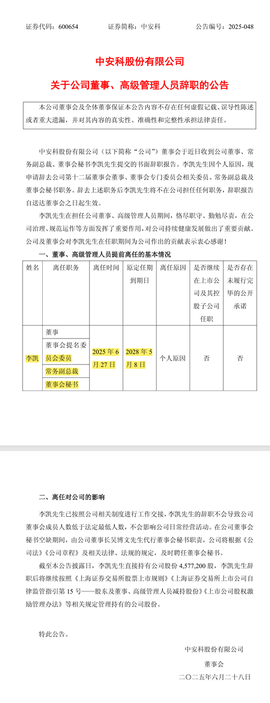仅仅过了一个多月,李凯突然提交辞职报告,把董事、常务副总裁、董秘所有职务都辞了,彻底离开公司。官方理由是“个人原因”。